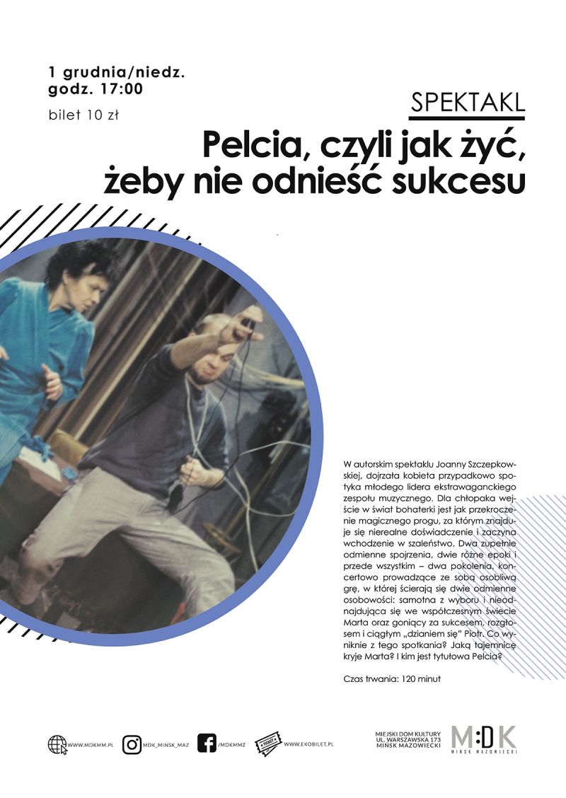 W autorskim spektaklu Joanny Szczepkowskiej dojrzała kobieta przypadkowo spotyka młodego lidera ekstrawaganckiego zespołu muzycznego. Dla chłopaka wejście w świat bohaterki jest jak przekroczenie magicznego progu, za którym znajduje się nierealne doświadczenie i zaczyna wchodzenie w szaleństwo. Dwa zupełnie odmienne spojrzenia, dwie różne epoki i przede wszystkim – dwa pokolenia, koncertowo prowadzące ze sobą osobliwą grę, w której ścierają się dwie odmienne osobowości: samotna z wyboru i nieodnajdująca się we współczesnym świecie Marta oraz goniący za sukcesem, rozgłosem i ciągłym „dzianiem się” Piotr. Co wyniknie z tego spotkania? Jaką tajemnicę kryje Marta? I kim jest tytułowa Pelcia?