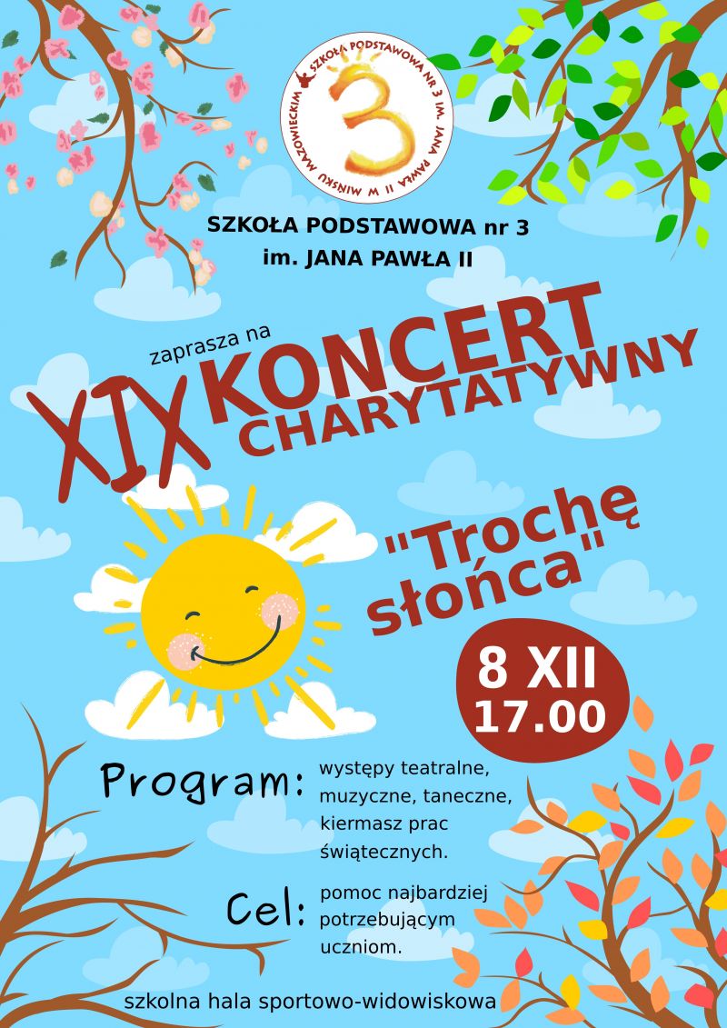 Zapraszamy serdecznie na XIX Koncert Charytatywny „Trochę słońca”, który odbędzie się 8 grudnia (w niedzielę) o godz. 17.00 w hali sportowej w Szkole Podstawowej nr 3 im. Jana Pawła II w Mińsku Mazowieckim. W tym roku motywem przewodnim koncertu będą cztery pory roku. Na scenie zobaczymy uczniów, nauczycieli, rodziców i absolwentów w występach teatralnych, tanecznych i muzycznych. Koncertowi będzie towarzyszył kiermasz artystycznych prac świątecznych. Jak zawsze koncertujemy, by zbierać pieniądze dla uczniów „papieskiej trójki najbardziej potrzebujących wsparcia finansowego. Zapraszamy! Pomaganie jest fajne!
