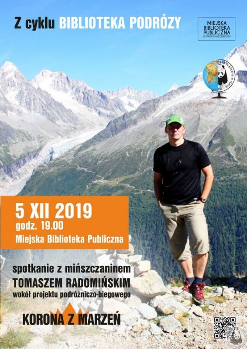 5 grudnia, o godz. 18:30 – w ramach cyklu „Biblioteka Podróży” naszym gościem będzie Tomasz Radomiński, mińszczanin, uczestnik projektu „Korona z marzeń”. Projekt zakłada wejścia na najwyższe szczyty państw naszego kontynentu oraz przebiegnięcie dystansu maratońskiego w stolicy każdego kraju w Europie. Celem całego przedsięwzięcia jest zdobycie Korony Gór Europy i Korony Maratonów Europy.