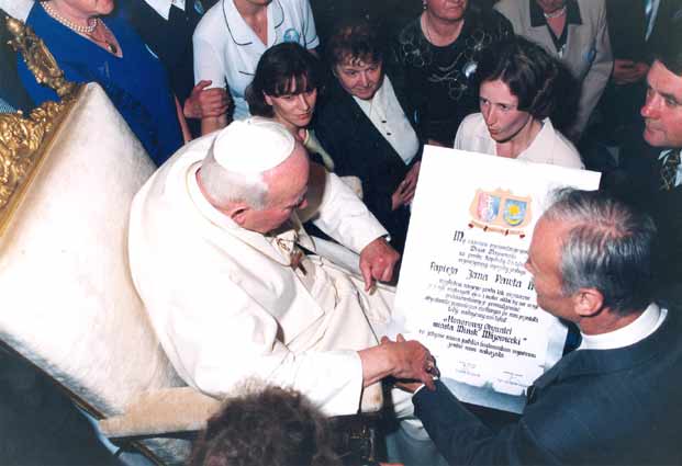 Ojciec Święty Jan Paweł II otrzymał akt nadania tytułu Honorowego Obywatela Miasta Mińsk Mazowieki dnia 11 kwietnia 1999r. na Watykanie, od pielgrzymów z Mińska Mazowieckiego pod przewodnictwem ks. Proboszcza Jana Byrskiego z rąk Burmistrza Miasta Zbigniewa Grzesiaka. Wtedy również otrzymał i pobłogosławił symboliczne klucze do serc i bram naszego miasta.