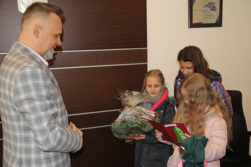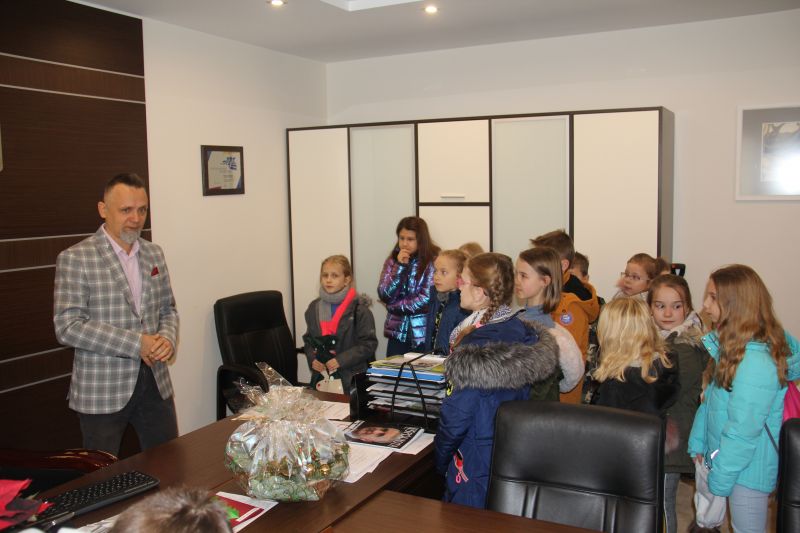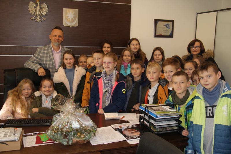 Dzieci przygotowały świąteczne upominki dla Burmistrza i Komendant SM oraz przekazali życzenia od społeczności szkolnej. Gospodarze odwdzięczyli się dzieciom drobnymi upominkami.