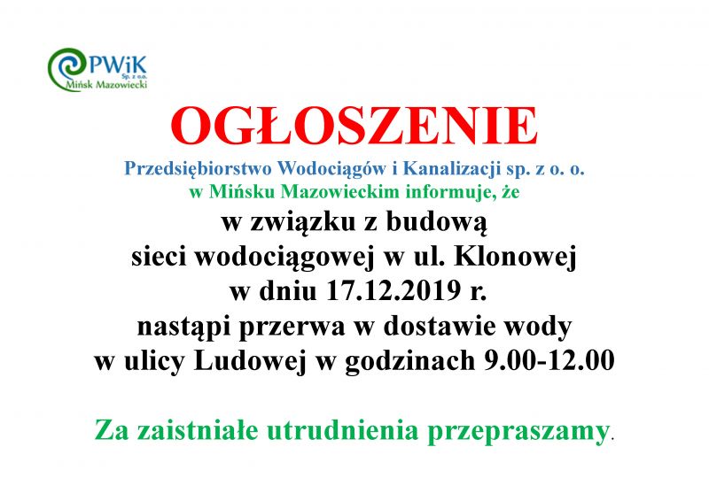 17 grudnia 2019 r. nastąpi przerwa w dostawie wody w ulicy Ludowej w godzinach 9.00-12.00 |