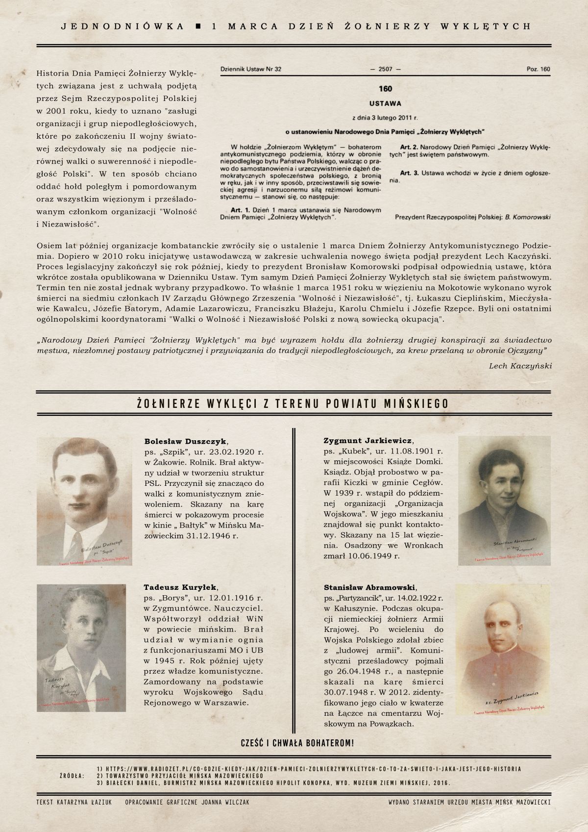 1 marca obchodzimy Dzień Żołnierzy Wyklętych. To święto tych, którzy po 1944 roku nie zgodzili się, by Polską rządziła komunistyczna władza z nadania Moskwy. Marząc o wolnej Polsce, nie złożyli broni mimo zakończenia działań wojennych. Niektórzy za tę postawę zapłacili najwyższą cenę. Komuniści zamierzali zniszczyć tę część polskiego społeczeństwa i zatrzeć po niej ślad na zawsze.