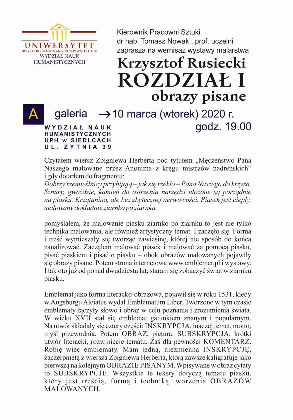 10 marca 2020, godzi. 19.00 A galeria, Wydział Nauk Humanistycznych UPH w Siedlcach , ul. Żytnia 39.