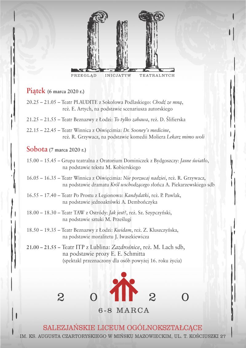 Salezjańskie Liceum Ogólnokształcące im. ks. Augusta Czartoryskiego w Mińsku Mazowieckim organizuje w dniach 6-8 marca 2020 r. ogólnopolski Przegląd Inicjatyw Teatralnych.