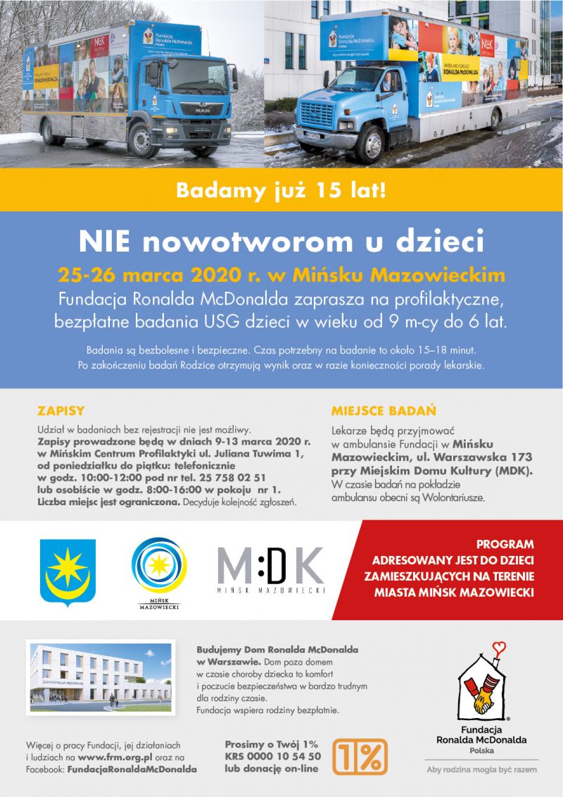 Na badania zapraszamy dzieci zamieszkujące na terenie miasta Mińsk Mazowiecki, w wieku od 9. miesiąca życia do 6. roku życia. Ambulans Fundacji Ronalda McDonalda stacjonował będzie w dniach 25 i 26 marca (środa i czwartek) na placu przed Miejskim Domem Kultury (ul. Warszawska 173).