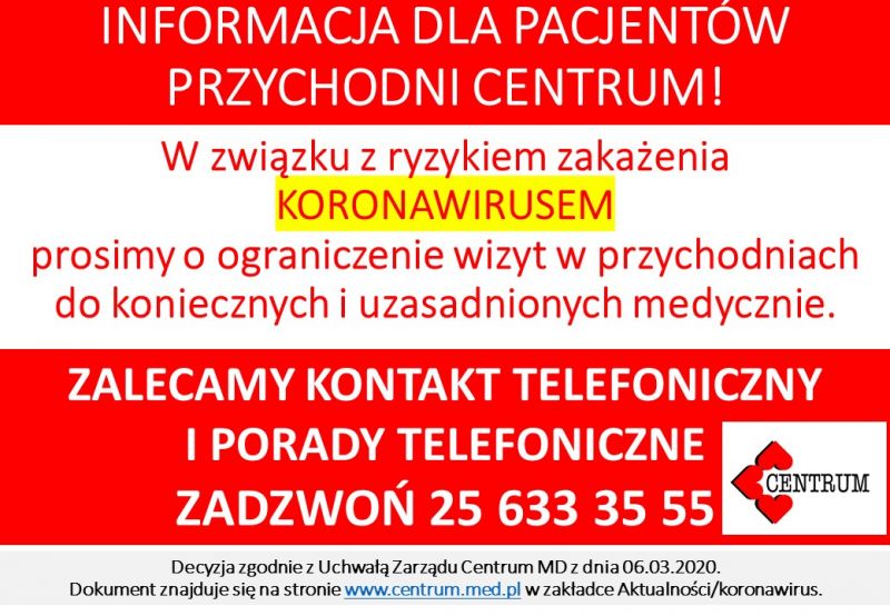 Zapisy na badania będą prowadzone w dniach 9-13 marca 2020 r. w Miejskiego Centrum Profilaktyki, ul. Juliana Tuwima 1, telefonicznie w godz. 10:00 – 12:00 pod nr. tel.: 25 758 02 51 lub osobiście w godzinach 8:00 – 16:00 w pokoju nr 1. Liczba miejsc jest ograniczona. Decyduje kolejność zgłoszeń. Udział w badaniach bez rejestracji nie jest możliwy.