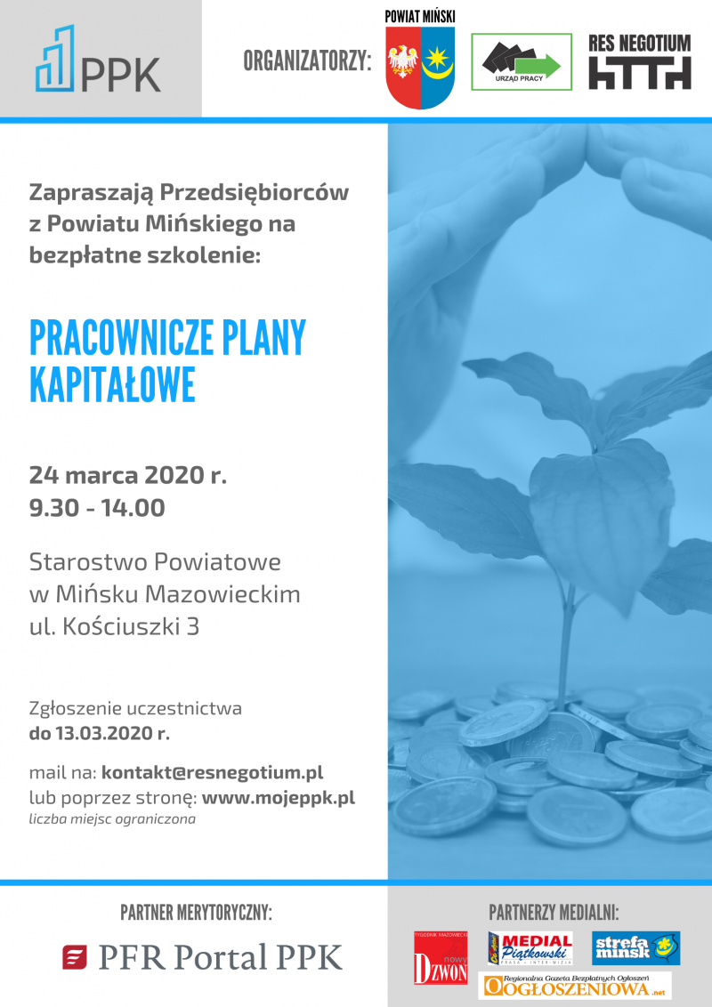 Starosta Miński, Dyrektor Powiatowego Urzędu Pracy w Mińsku Mazowieckim i Prezes Stowarzyszenia Res Negotium mają zaszczyt zaprosić na bezpłatne szkolenie, którego tematem będą: Pracownicze Plany Kapitałowe (PPK)... szczegóły w załącznikach.